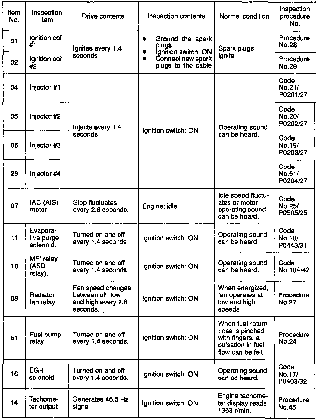 Actuator Test Reference Table
