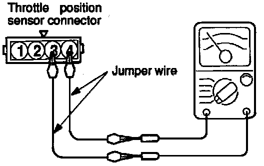 2. Connect an ohmmeter between terminal 3 (closed throttle position switch) and 4 (sensor ground) by using jumper wires.
