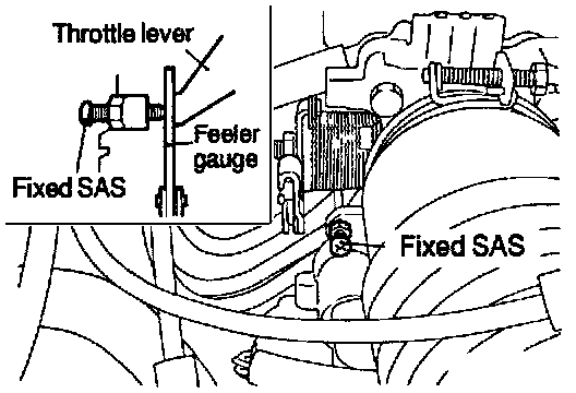 3. Insert a feeler gauge with a thickness of 0.45 mm (.0177 in.) between the fixed Speed Adjusting Screw (SAS) and the throttle lever.