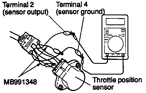b. Connect a digital Voltmeter between the throttle position sensor terminal 2 (sensor output) and terminal 4 (sensor ground.)