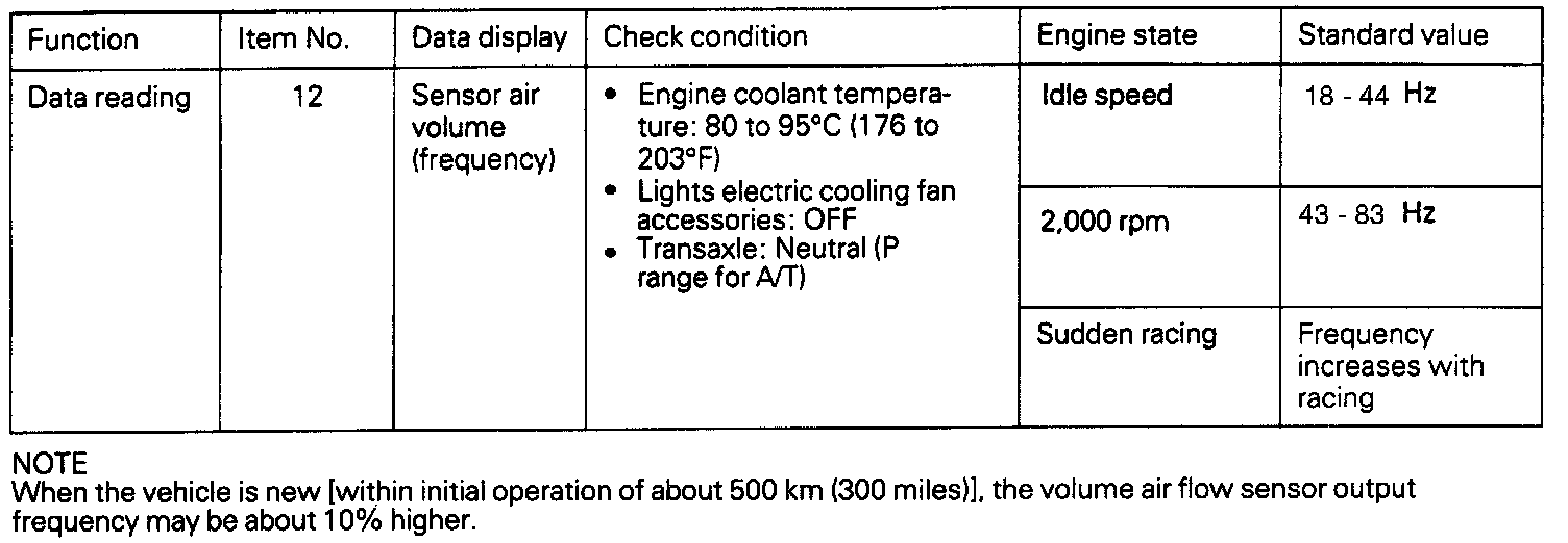 Hint 2: If the volume air flow sensor output frequency is other than 0 when the ignition switch is turned ON (but not starting the engine), faulty volume air flow sensor or engine control module is suspected.