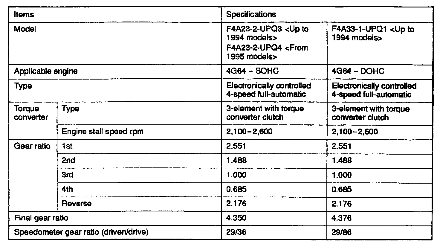 F4A23/F4A33 4-spd A/T, Gear Ratios: