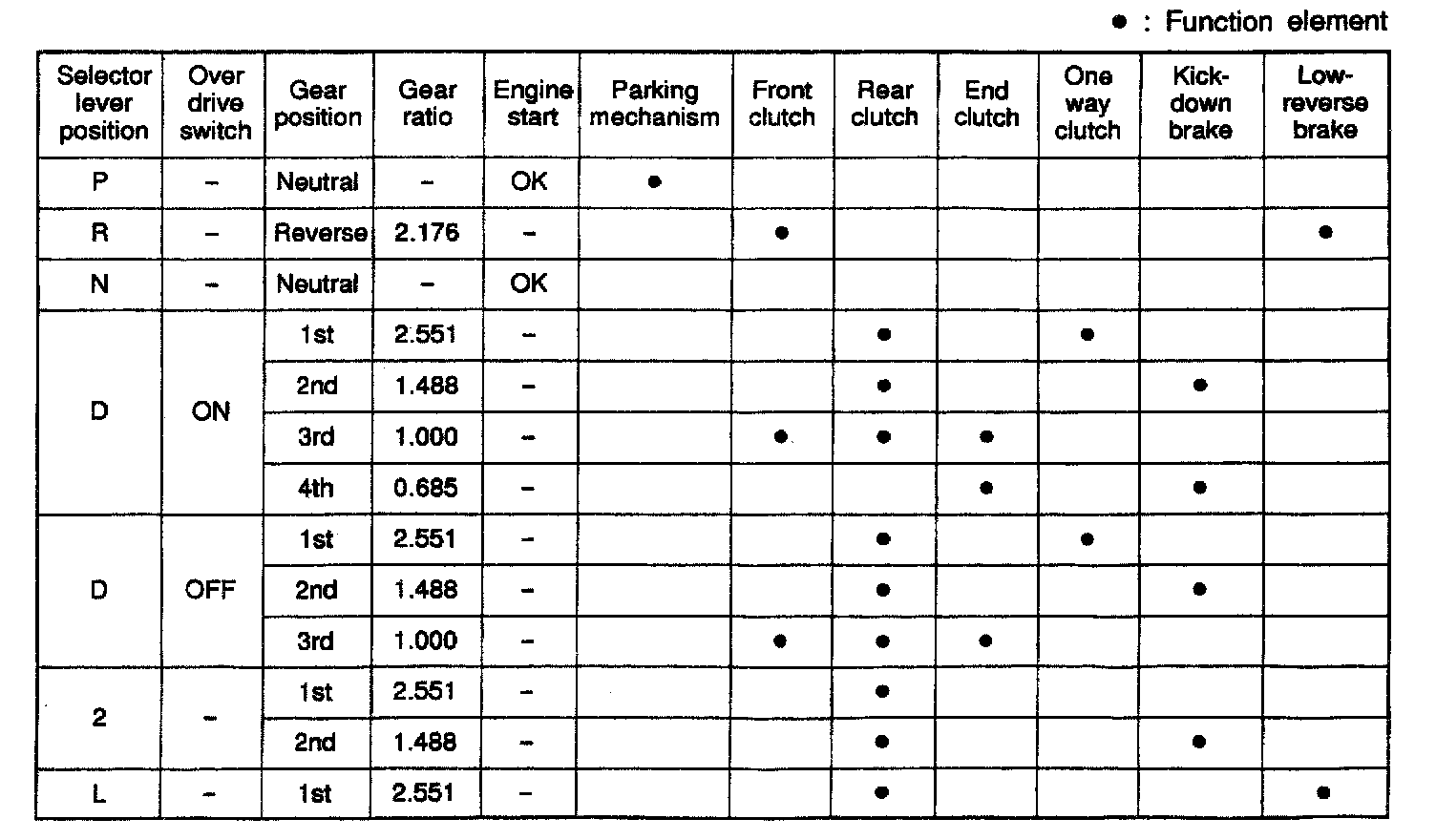 F4A23/F4A33 4-spd A/T, Function Element Table:
