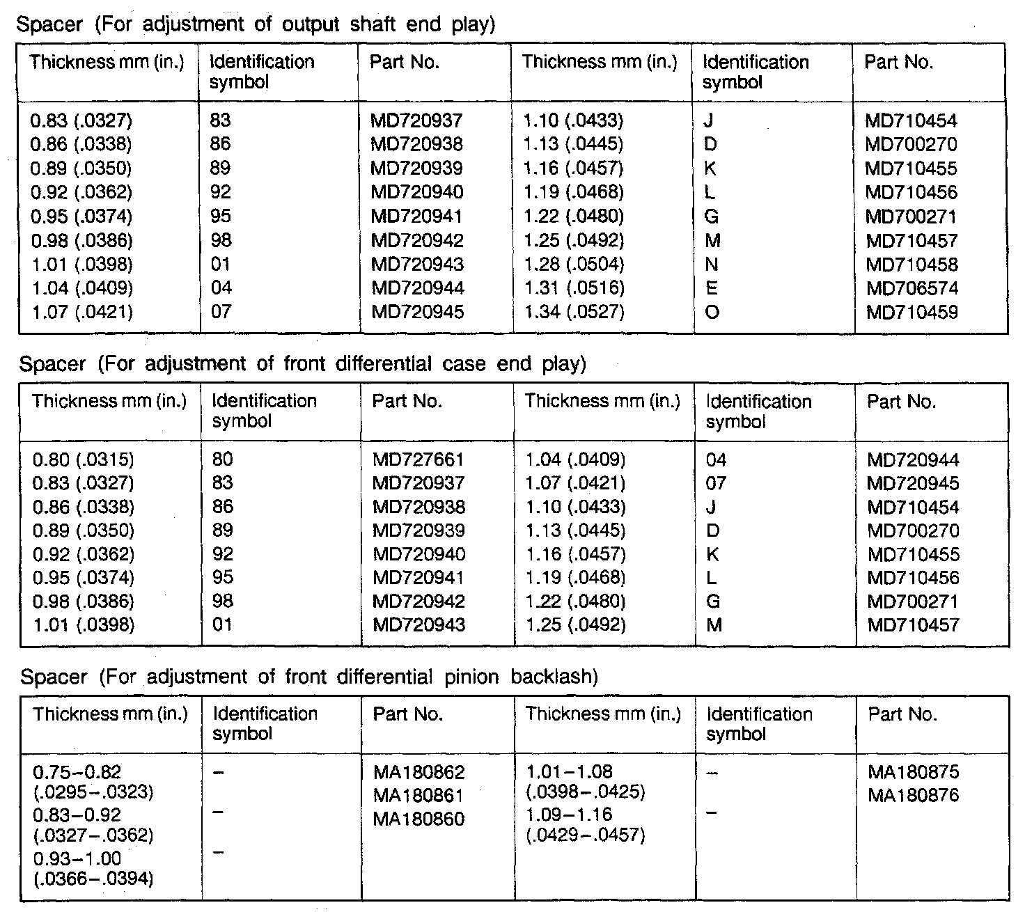 F5M31 5-spd M/T, Differential Standard Values: