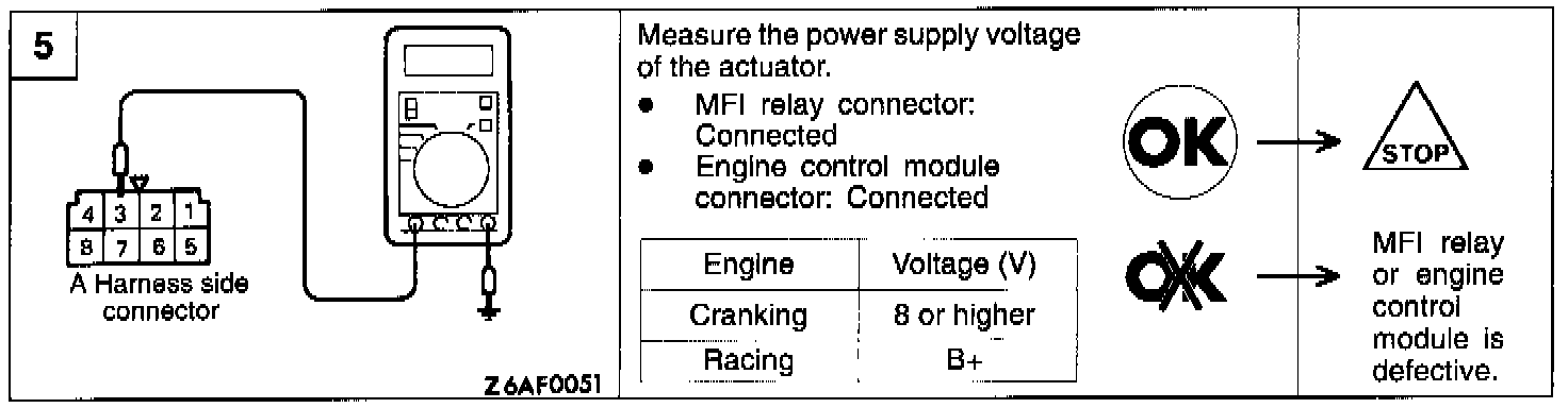 4. Using jumper wires, connect terminal (8) of the MFI relay to the positive battery terminal and connect terminal (6) of the relay to the negative battery terminal.