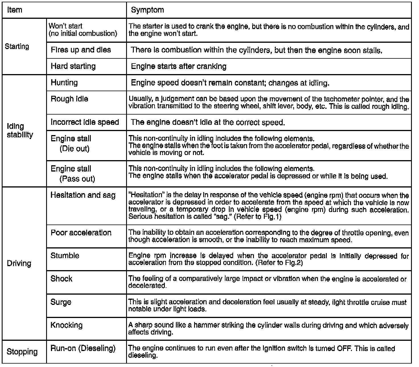 This chart defines terms used in the "Check Chart Classified By Problem Areas and Symptoms" and the symptoms associated with those terms.