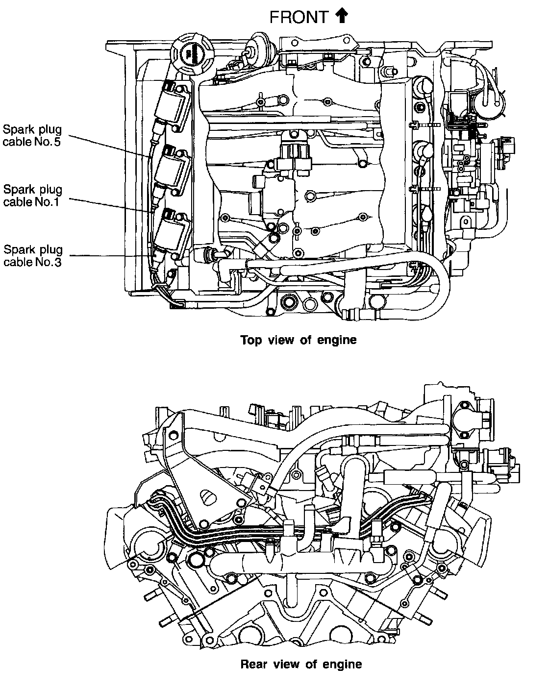 Improper arrangement of ignition cables will induce voltage between the cables, causing mis-firing and development of a surge at acceleration in high-speed operation. Therefore, be careful to arrange the spark plug cables properly by the following procedure: