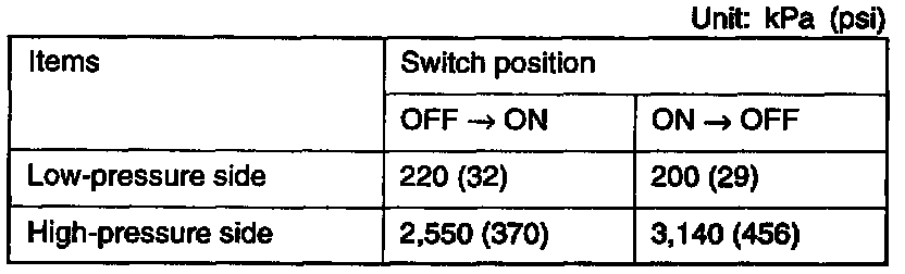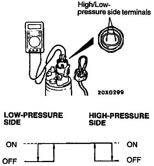 3. When the high/low-pressure sides of the dual pressure switch are at operating pressure (ON) and there is continuity between the respective terminals, then the condition is normal. If there is no continuity, replace the switch.