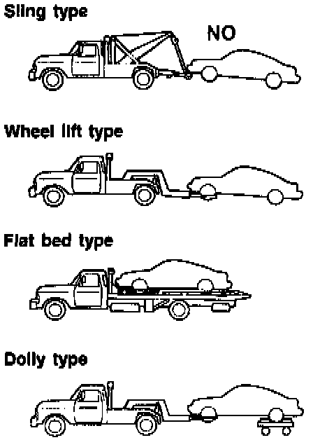 If this vehicle is towed, use wheel lift type, flat bed type or dolly type equipment.