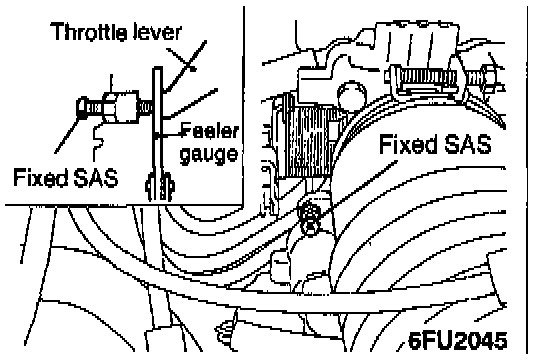 3. Insert a feeler gauge with a thickness of 0.45 mm (.0177 in.) between the fixed SAS and the throttle lever.