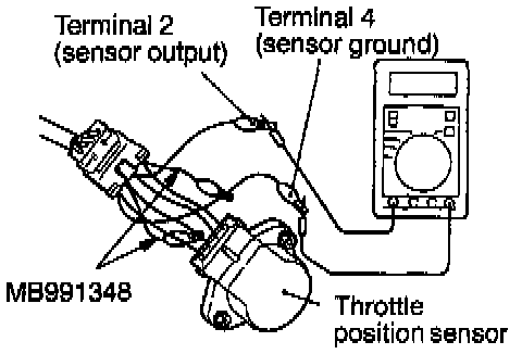 (2) Connect a digital Voltmeter between the throttle position sensor terminal 2 (sensor output) and terminal 4 (sensor ground.)