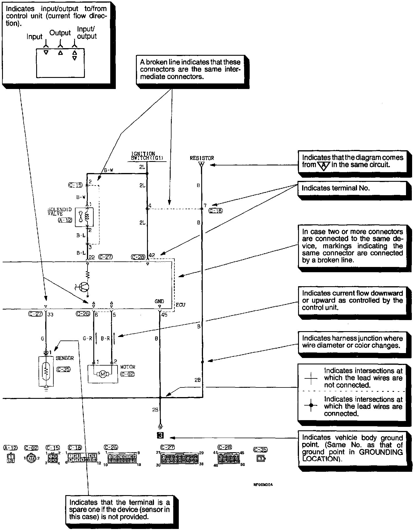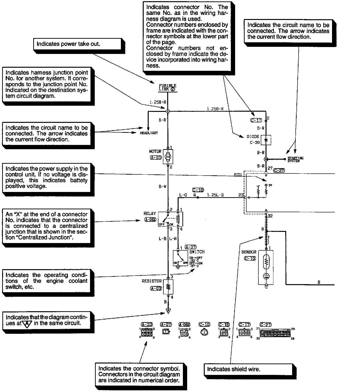 The circuit of each system from the fuse (or fusible link) to ground is shown. The power supply is shown at the top and the ground at the bottom to facilitate understanding of how the current flows.