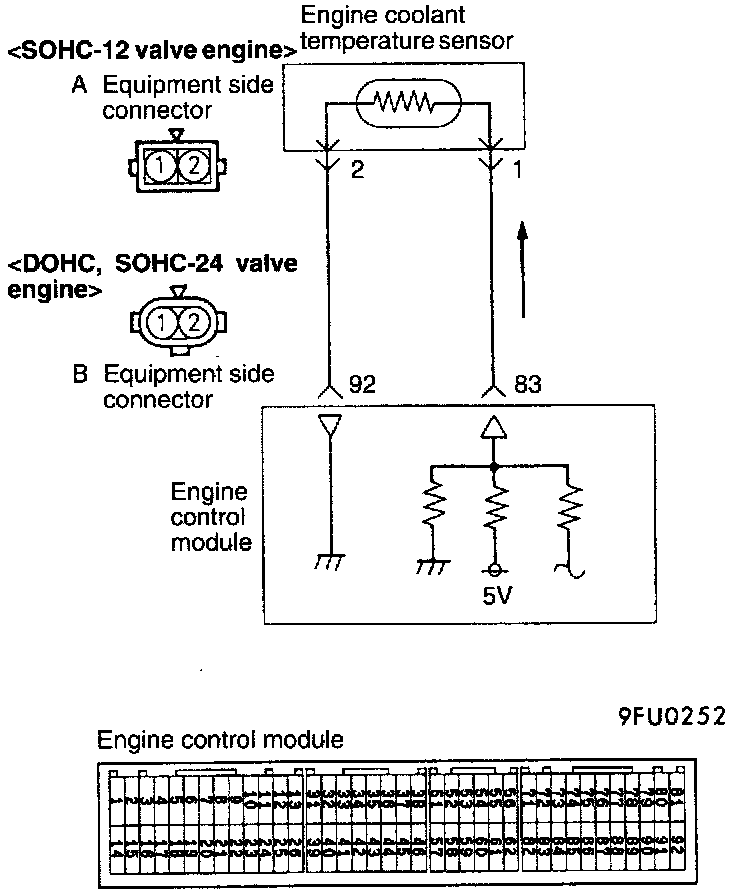 - The 5 V power supply within the engine control module is supplied, by way of the resistance within the unit, to the engine coolant temperature sensor; it passes through the engine coolant temperature sensor, which is a type of resistor, and is grounded at the engine control module. Note that the resistance of the engine coolant temperature sensor decreases when the temperature of the engine coolant increases.