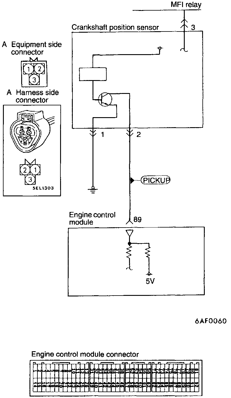 - The power for the crankshaft position sensor is supplied from the MFI relay and is grounded to the vehicle body. The crankshaft position sensor, by intermitting the flow (to ground) of the 5 V voltage applied from the engine control module, produces pulse signals.