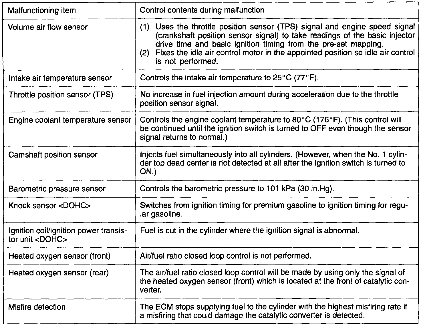 FAIL-SAFE/BACKUP FUNCTION QUICK REFERENCE TABLE