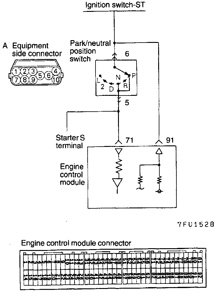 - Battery positive voltage inside the engine control module is applied via the resistance to the park/neutral position switch. When the selector lever is placed in the P or N position, continuity is created, between the engine control module's park/neutral position switch terminal and the ground via the starter motor, and the terminal voltage becomes low.