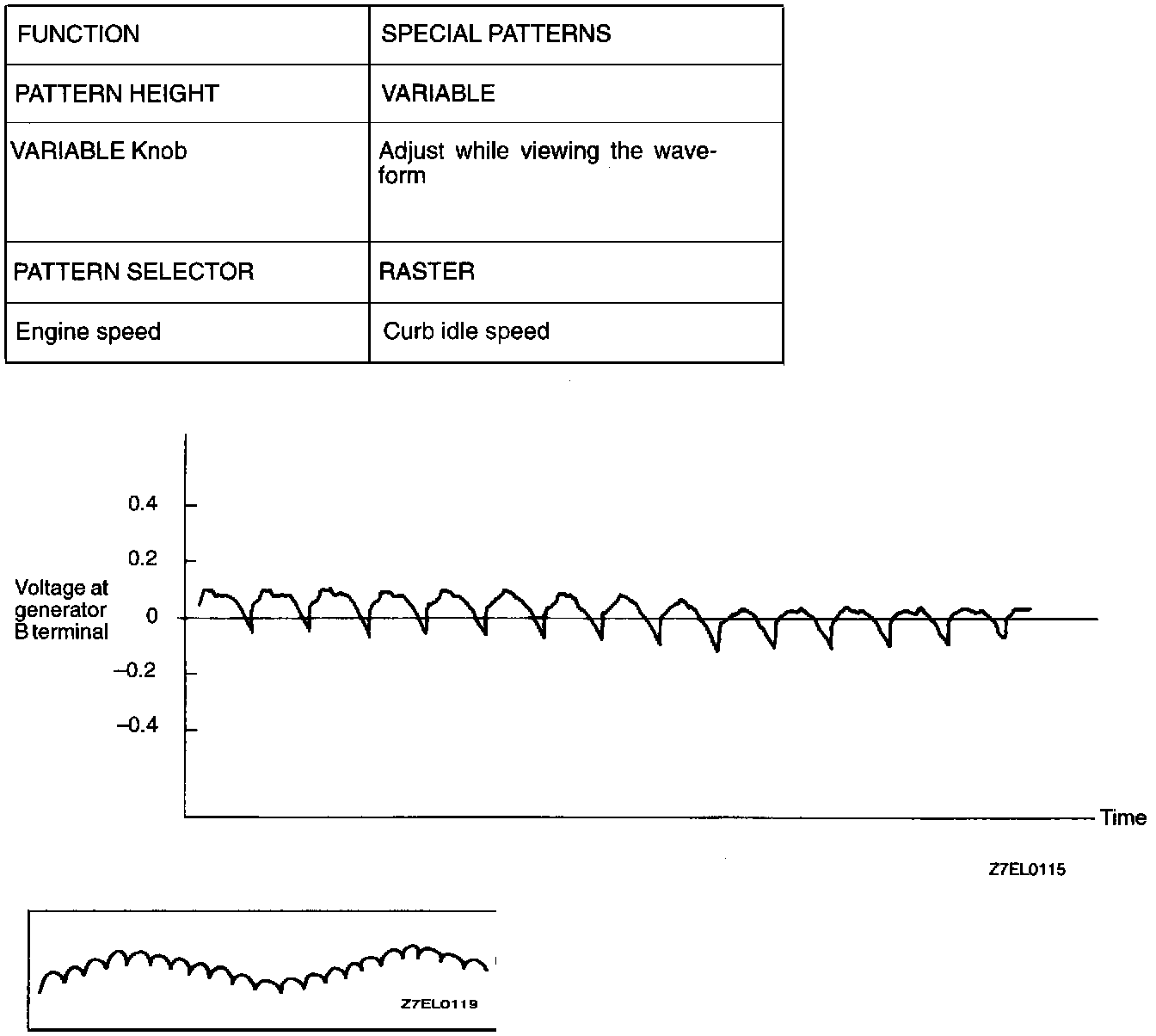NOTE: Furthermore, the voltage wave-form of the generator B terminal can undulate as shown at left. This wave-form is produced when the regulator operates according to fluctuations in the generator load (current), and is normal for the generator.