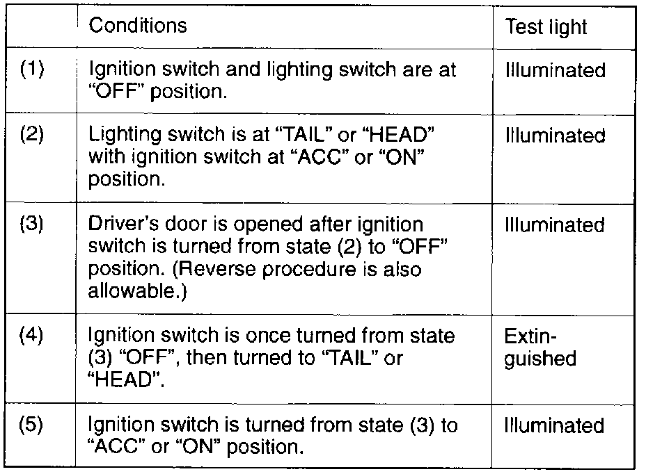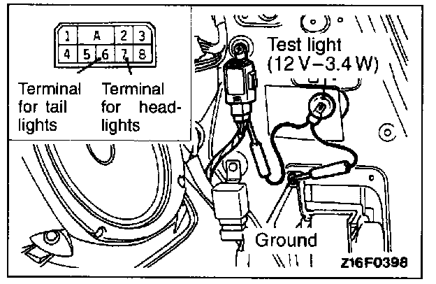 2. Keeping the connector connected to the light automatic shut-OFF unit, connect the test light (12 V-3.4 W) from the harness side to terminal No. 6 (for tail lights) or No. 7 (for headlights). Under the following conditions, check the operation of the test light.