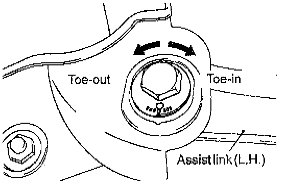 To adjust toe, turn the assist link mounting bolts (on crossmember side) on both sides the same amount.