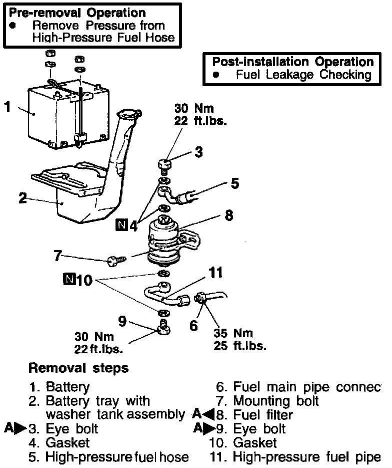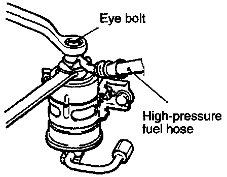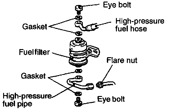 2. Holding the fuel filter nut, tighten the fuel main pipe's flare nut and eye bolt at the specified torque. Then tighten the filter to the bracket.