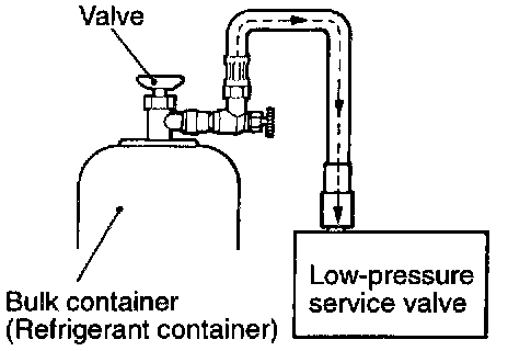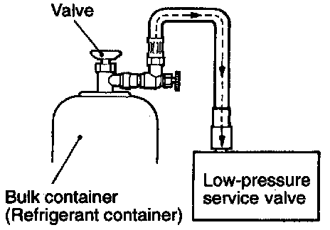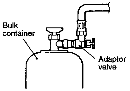 CAUTION: If the bulk container is inverted, liquid refrigerant may be drawn into the compressor damaging it by hydraulic lock. Keep the bulk container upright to ensure that refrigerant is charged in gas state.