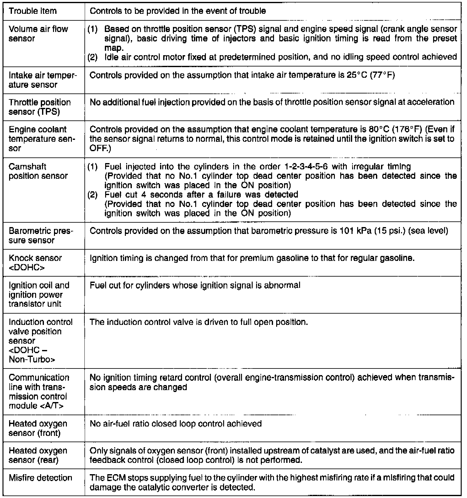 When the failure of a major sensor is detected by the on-board diagnostics, the preset control logic provides controls to assure safe operation of the vehicle.