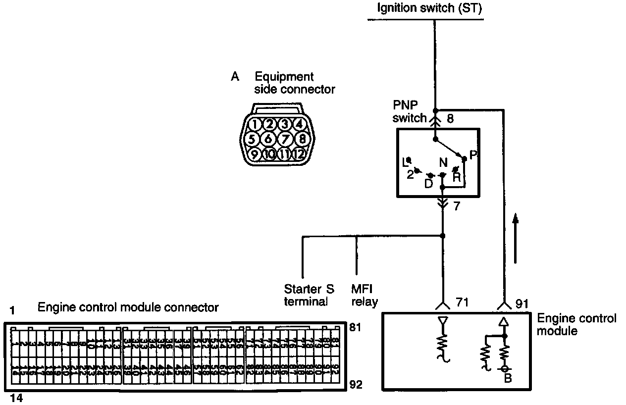- The battery voltage in the engine control module is applied through a resistor to the park/neutral position switch. When the selector lever is set to the P/N range, continuity is produced between the park/neutral position switch terminal of the engine control module and ground through the starter motor, thereby making the terminal voltage go low.