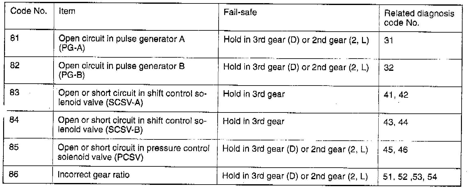 In addition, fail-safe codes lock the transaxle in 3rd or 2nd gear. Fail-safe will be canceled if the ignition switch is turned to OFF. The diagnostic trouble codes will remain.
