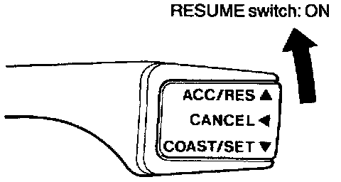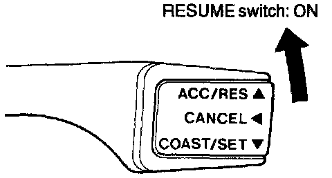 3. Turn the control switch to RESUME while driving at a vehicle speed of approximately 40 km/h (25 mph) or higher, and check that there is a return to the cruise control speed before the function is canceled and the vehicle travels at a constant speed.