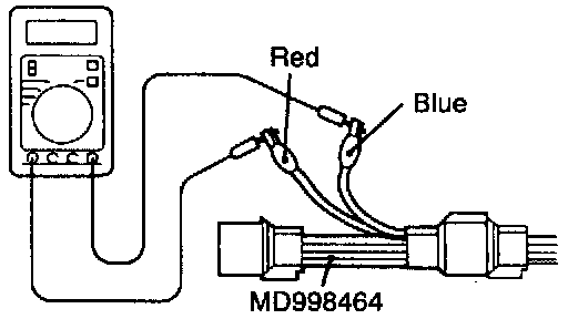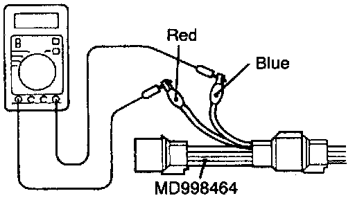 (2) Check that there is continuity between terminal (1) (red clip of the special tool) and terminal (3) (blue clip) of the heated oxygen sensor connector [approx. 12 Ohms at a temperature of 20°C (68°F)].