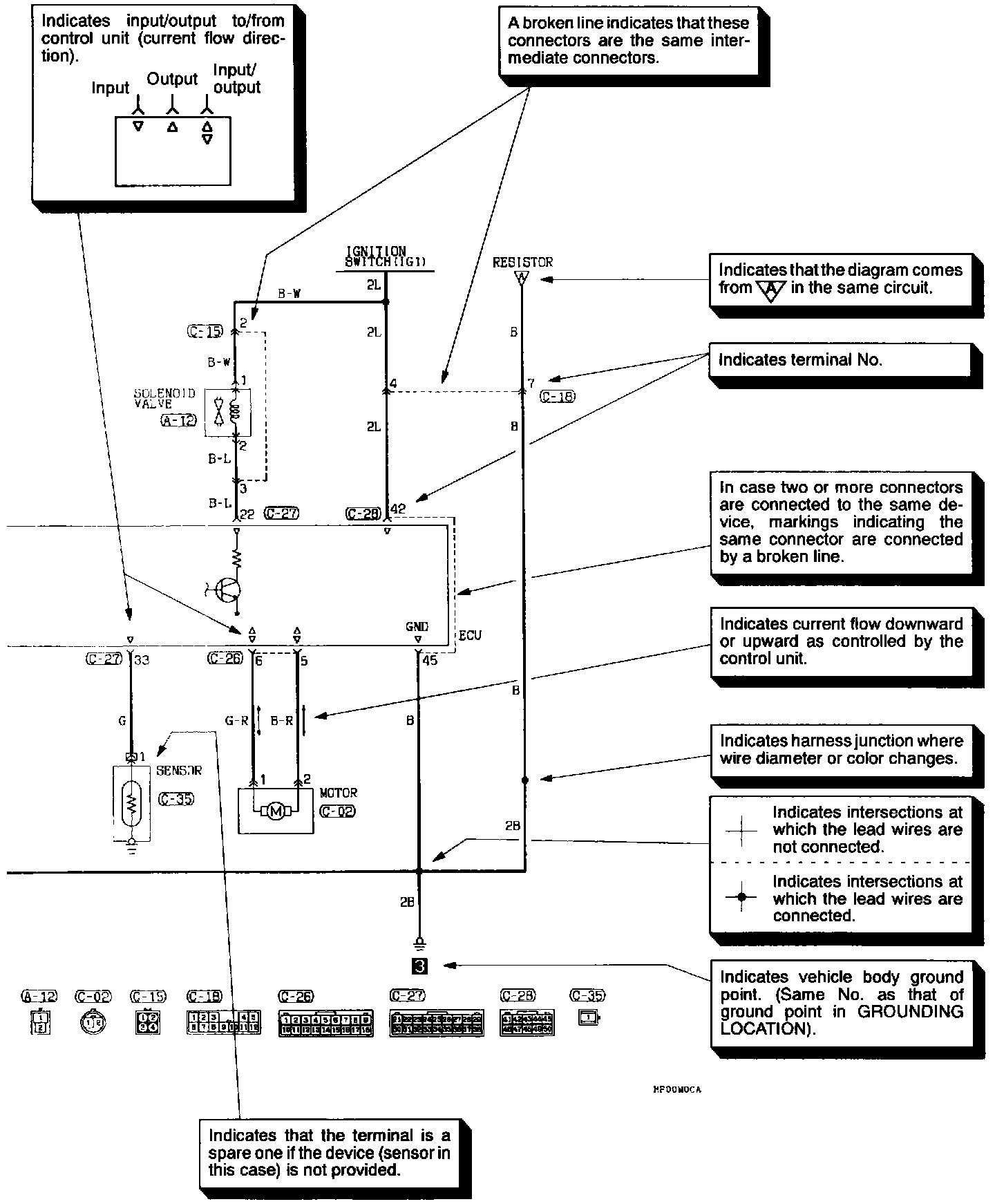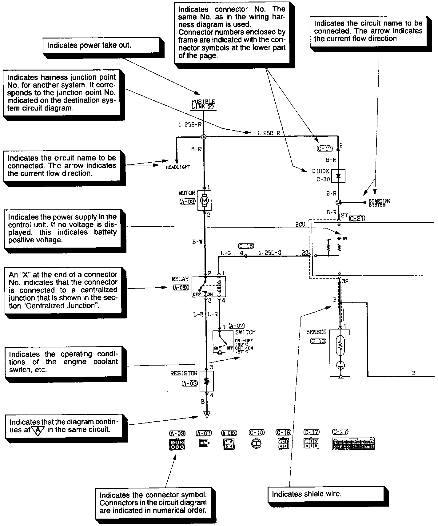 The circuit of each system from the fuse (or fusible link) to ground is shown. The power supply is shown at the top and the ground at the bottom to facilitate understanding of how the current flows.