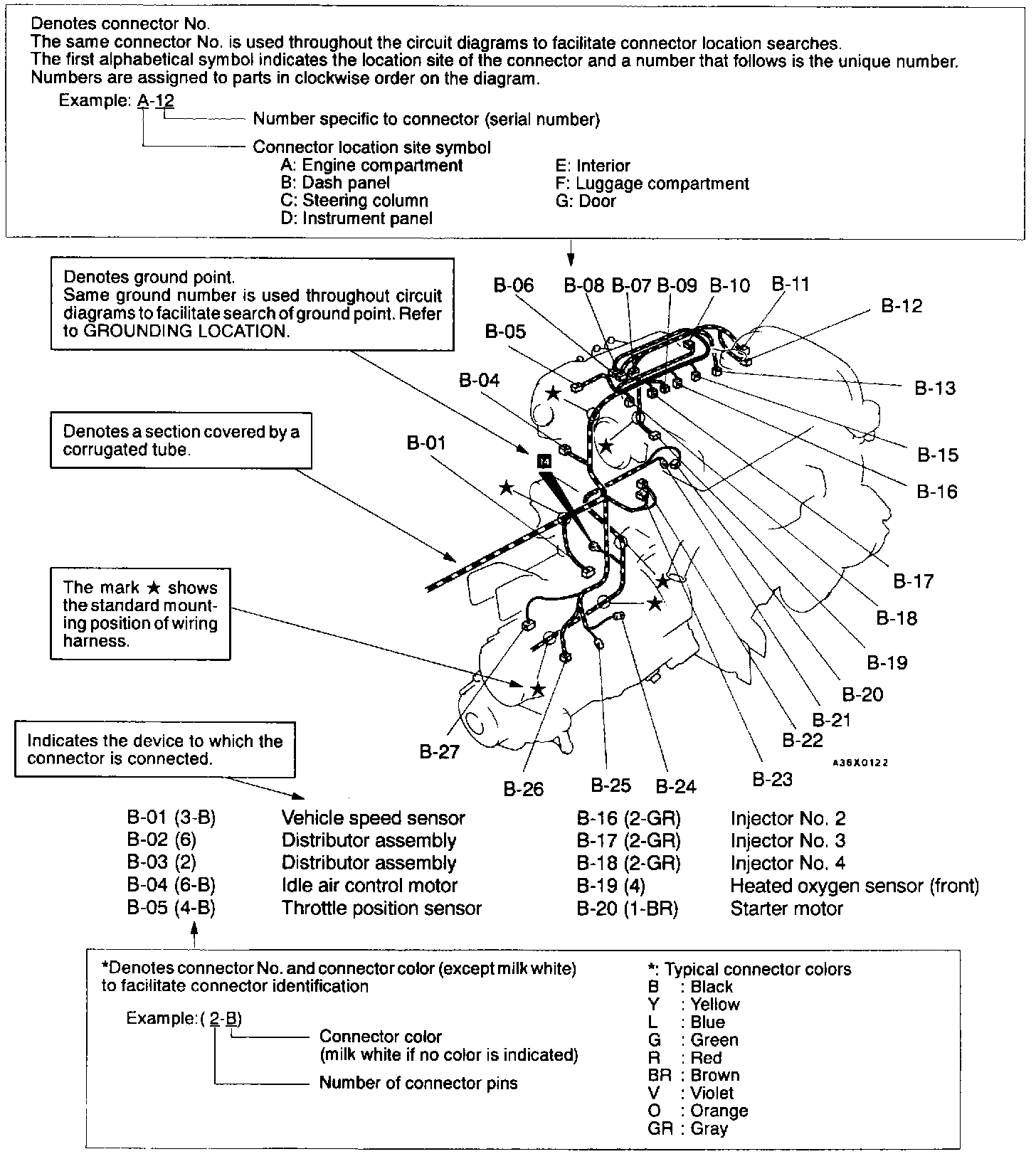 The Wiring harness diagram clearly show the connector locations and harness routings at each site on actual vehicles.