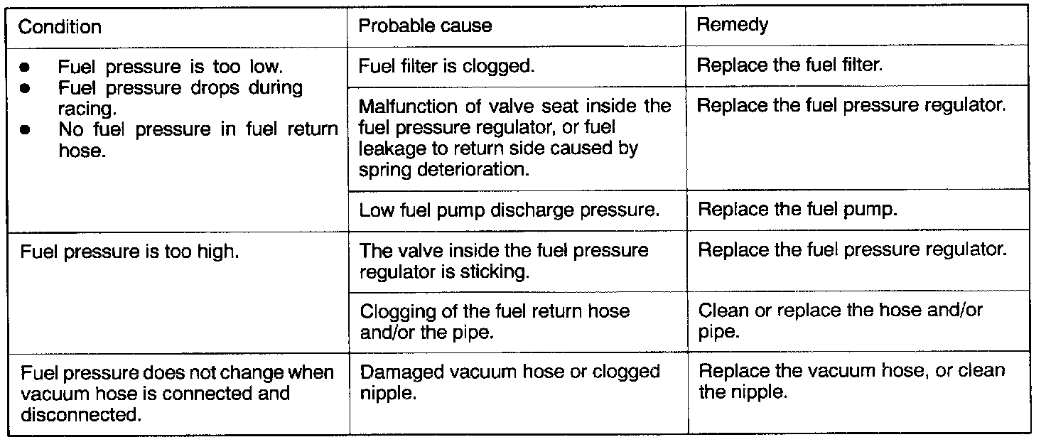 12. If the fuel pressure measured in steps (9) to (12) is outside the standard value range, check for the probable cause by referring to the following table, and then make the appropriate repair.