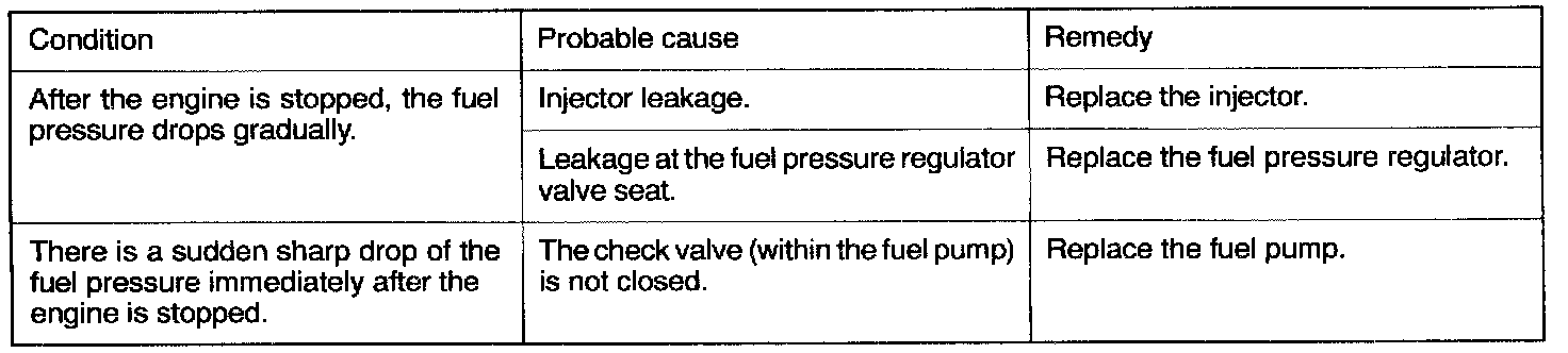 13. Stop the engine and check for a change of the value indicated by the fuel pressure gage. The condition is normal if there is no decrease in the indicated value within two minutes. If there is a decrease in the indicated value, monitor the speed of the decrease, and, referring to the following table, determine the cause of the problem and make the appropriate repair.