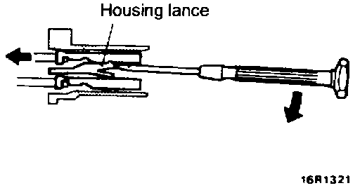 3. Insert tip of screwdriver [1.4 mm (0.06 in.) width] into connector in a manner as shown in the figure. Raise housing lance slightly with it and pull out harness.