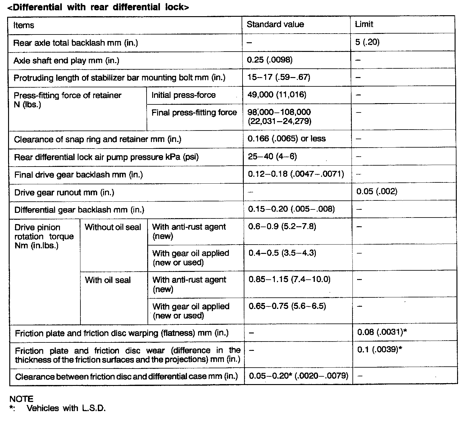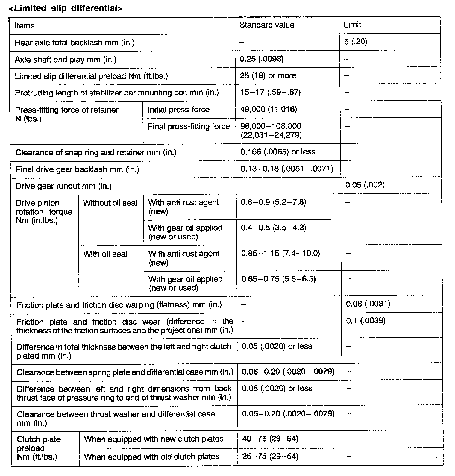4WD Rear Differential Standard Values & Limits (LSD):