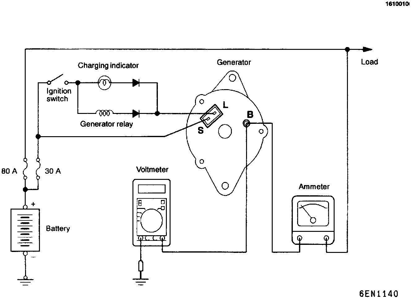- If the electrical load is small while testing, the specified level of current may not be output even though the generator is normal. In such cases, increase the electrical load by leaving the headlights on for sometime to discharge the battery or by using the lighting system in another vehicle, and then test again.