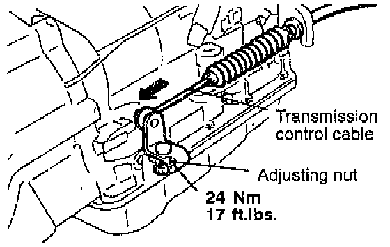 2. Loosen the adjusting nut, gently pull the end of the transmission control cable in the direction of the arrow and then tighten the adjusting nut to the specified torque.