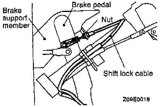 1. Install the shift lock cable to the brake pedal, and clamp the brake support member with the nut.