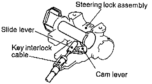 2. Install the slide lever, key interlock cable and cam lever to the steering lock assembly as shown in the illustration.