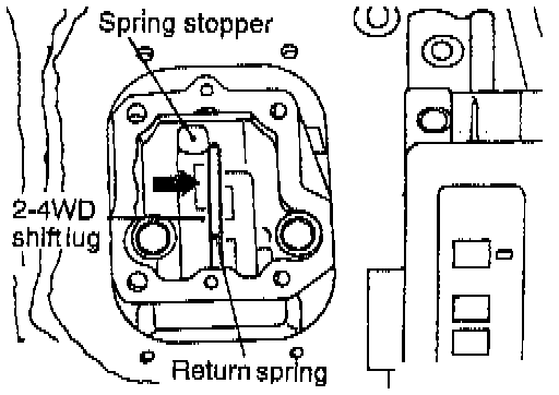 3. Check that the return spring is set to the spring stopper of the 2-4WD shift lug, and then install the control lever in the position shown by the arrow.