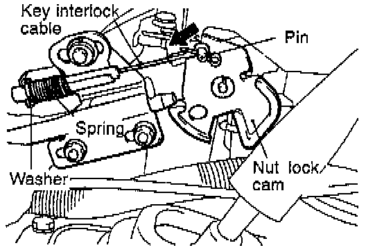 2. Install the spring and washer that are inserted onto the key interlock cable as shown in the illustration.