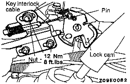e. Gently push the lock cam until the pin stops in the direction of the arrow mark as shown in the illustration, and then tighten the nut to the specified torque to clamp the key interlock cable.
