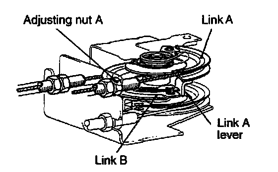9. Turn down adjusting nut A in the direction that the free travel of the inner cable of the cruise control cable is reduced. At the position where the lever of intermediate link A is brought into contact with intermediate link B, back off adjusting nut A the specified number of turns.