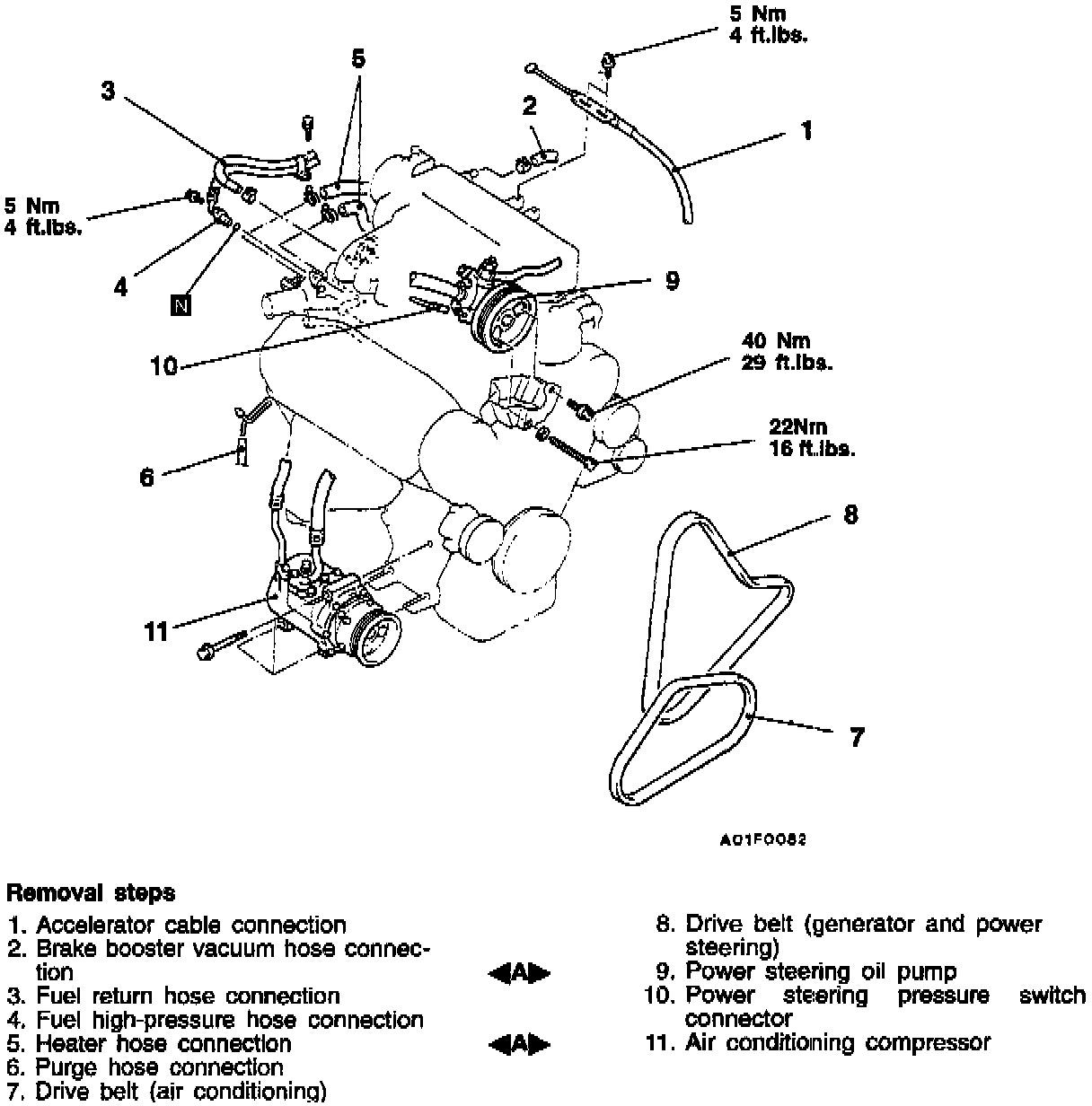NOTE: The removed power steering oil pump and air conditioning compressor should be fastened (by using rope, etc.) in a position that will not interfere with the removal/installation of the engine assembly.