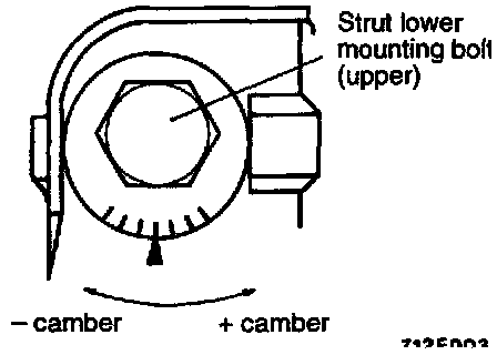 To adjust camber, turn the strut lower mounting bolt (upper). One graduation is equivalent to about 20' in camber. Caster has been factory-adjusted to the standard value and requires no adjustment.