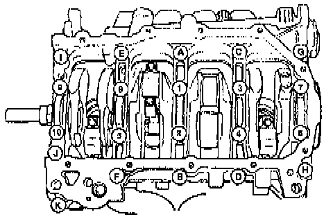 3. Main Bearing Bedplate to engine block bolts (A thru K) finger tight.
