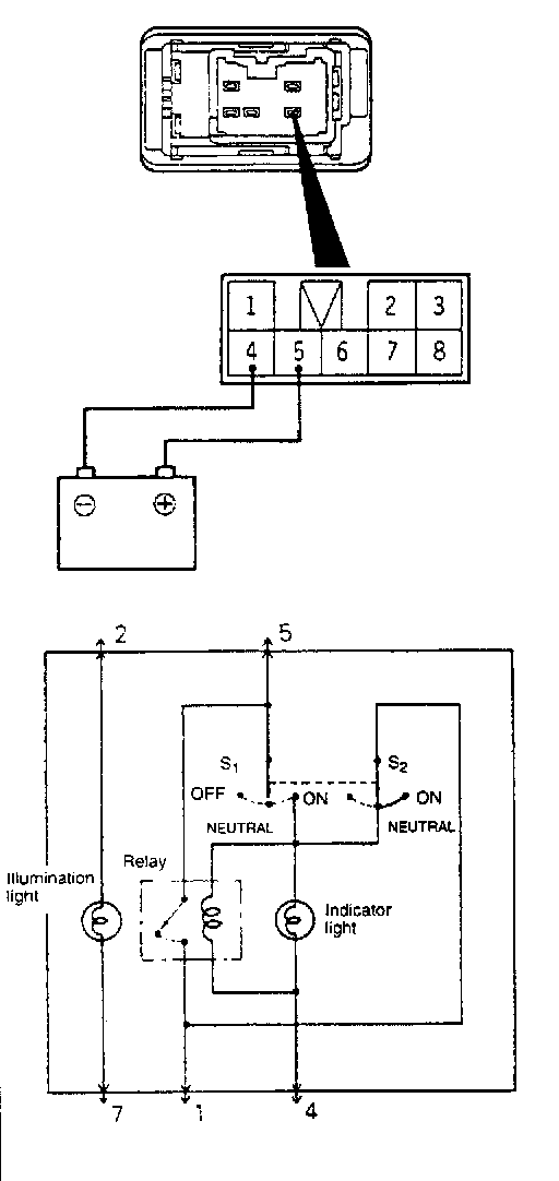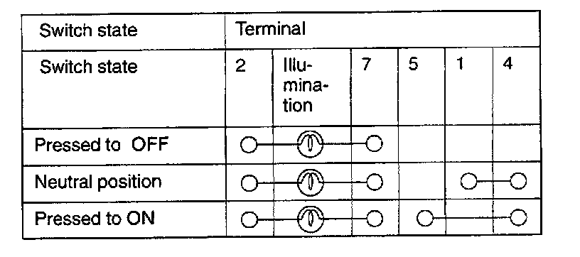 2. Connect the positive battery terminal to terminal (5) and the negative battery terminal to terminal (4), and then check that there is battery positive voltage between terminal (1) and the ground when the main switch is turned to ON and during the period before it is turned to OFF. Check that the battery positive voltage between terminal (1) and the ground is reduced to 0 V when the main switch is turned to OFF.