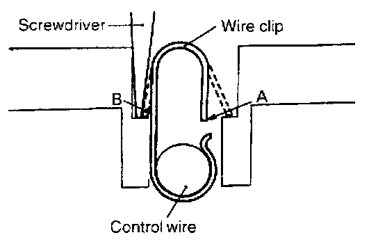 Remove the wire clip by inserting a screwdriver in the position shown in the illustration and pushing the wire clip in directions A and B.