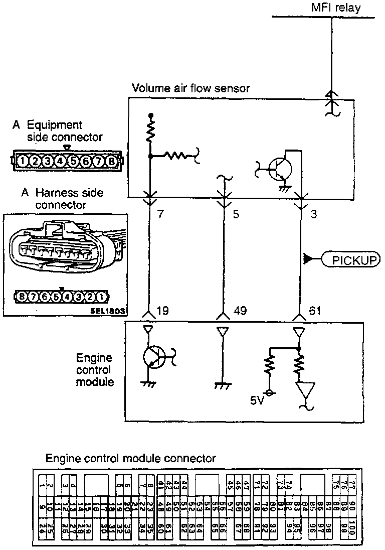 - The power for the volume air flow sensor is supplied from the MFI relay to the volume air flow sensor, and is grounded at the engine control module. The volume air flow sensor, by intermitting the flow of the 5 V voltage applied from the engine control module, produces pulse signals.